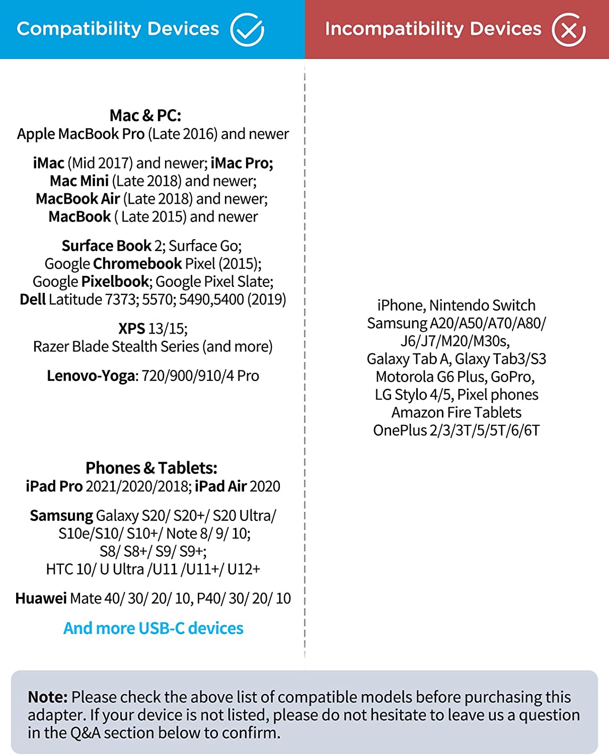 • 【Wide Compatibility】 The USB C to HDMI Adapter is compatible with MacBook Pro 2016-2022, MacBook Air 2018-2022, Mac,Mini 2018, i,Mac 2017-2020, Sur,face Book 2, Sam,sung Ga,laxy S20/S10/S9/S8/S8 Plus, Note 9/8, Hua,wei P30/20/10, Pixelbook, Dell-XPS 15/13, Ga,laxy Book, Chromebook, Chromebook Pixel and More. (Kind reminder: Not compatible with USB 2.0/3.0 version devices, Please confirm that your device has video output function before purchasing this adapter.)