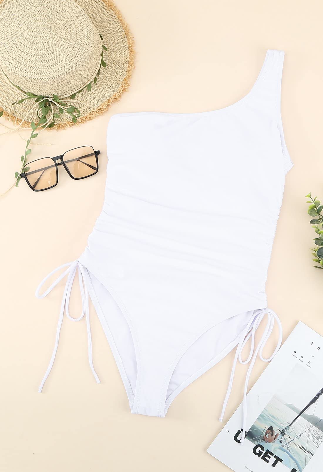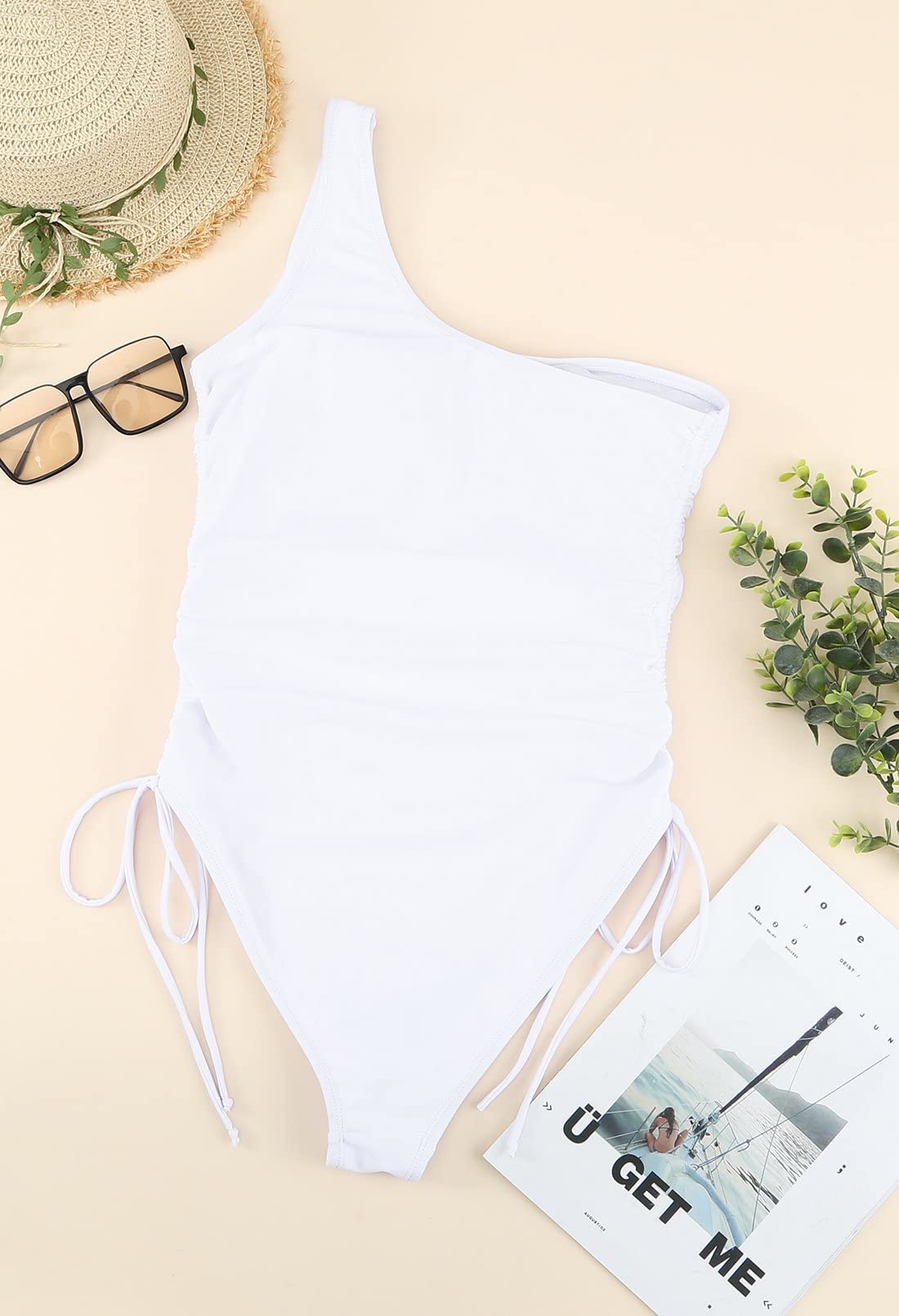 Viottiset Women's One Shoulder Ruched One Piece Swimsuit Tummy Control High Cut Cheeky Bathing Suit White Large