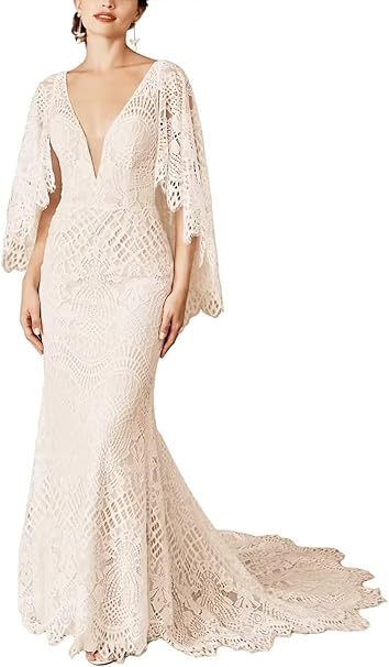 Women's Boho Cape Sleeves Wedding Dresses for Bride V Neck Floor Lenght Lace Mermaid Beach Vintage Wedding Gown
