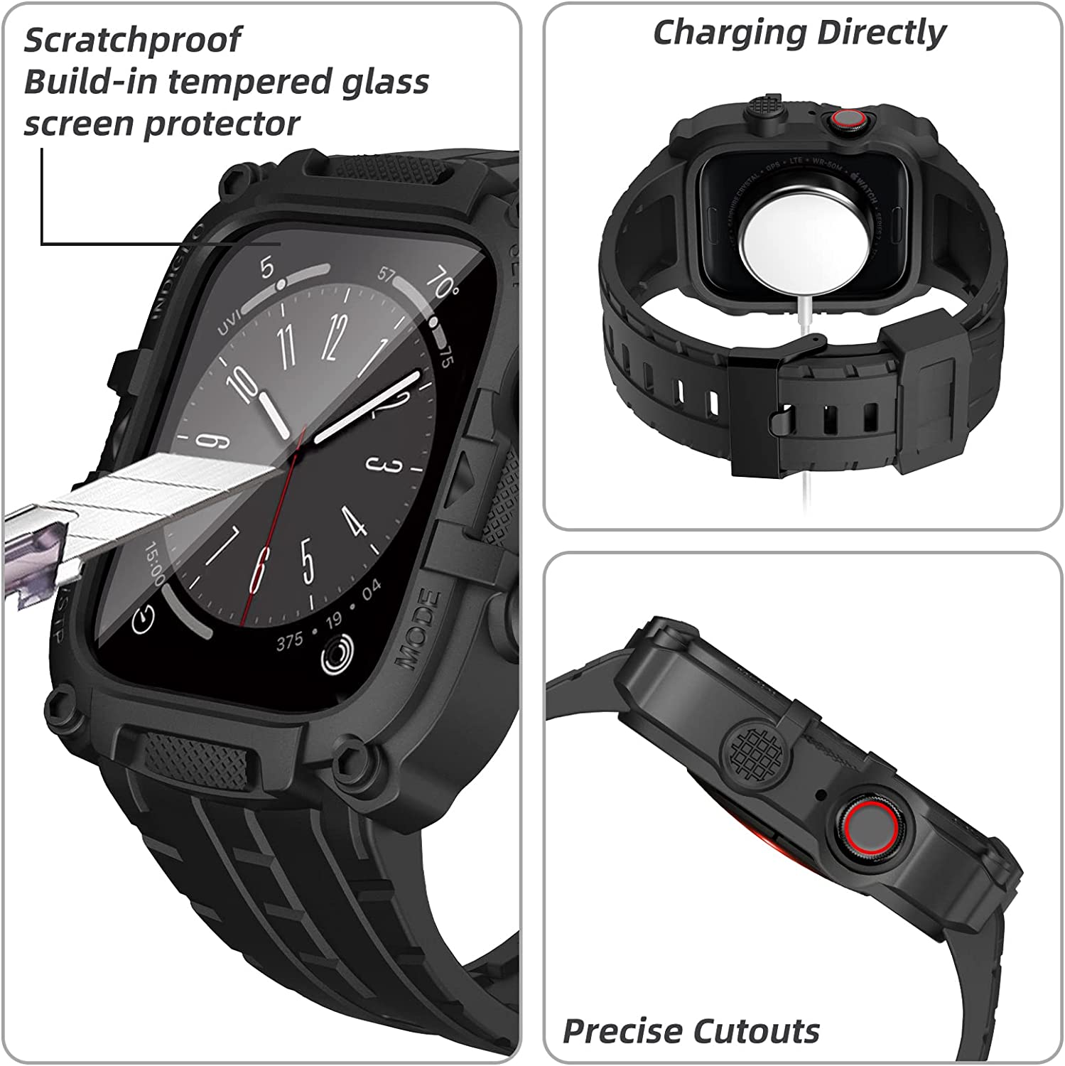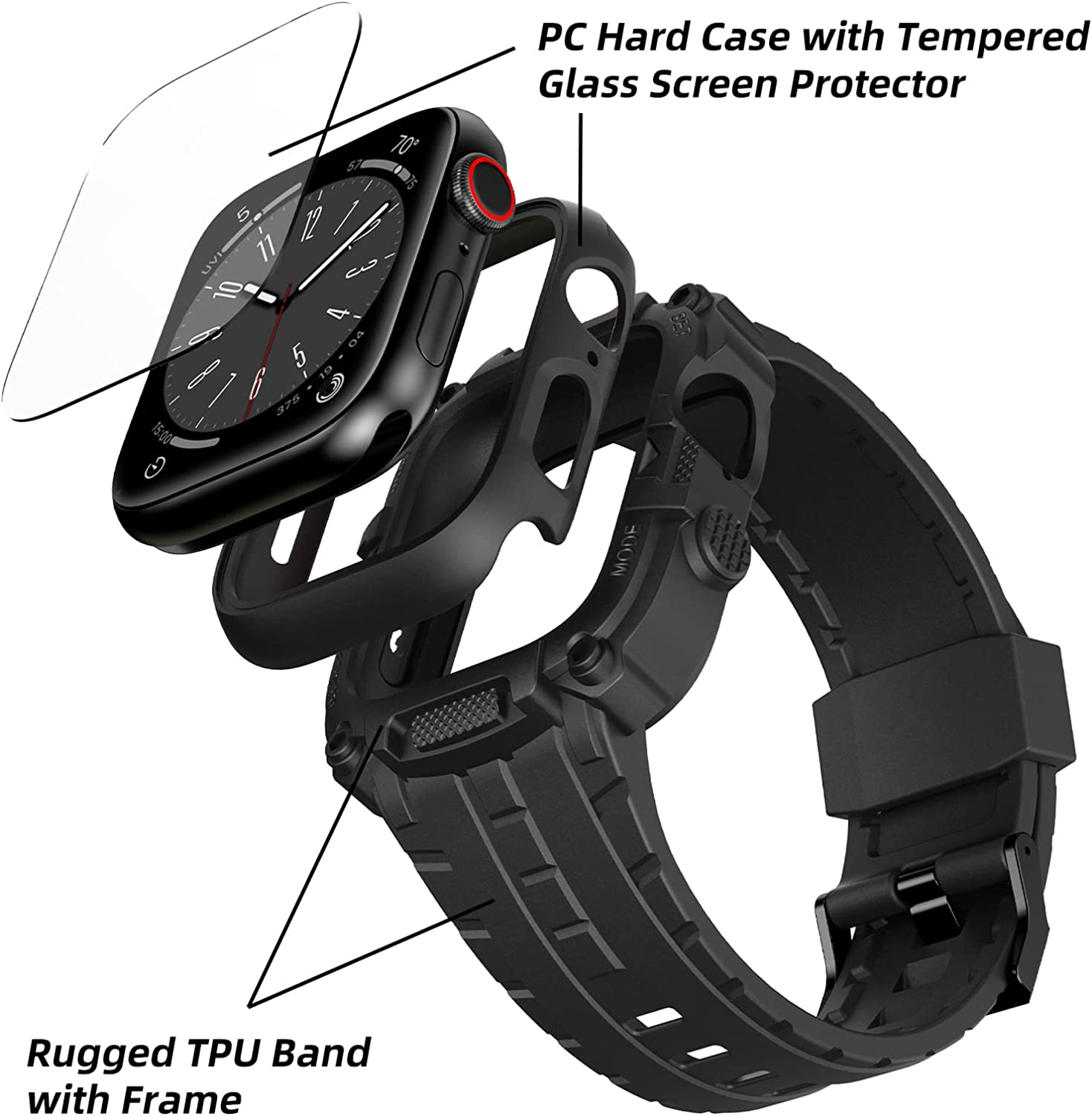 YALOCEA Compatible with Apple Watch Band 44mm with Case Built-in Screen Protector, Rugged Shockproof Strap Bumper Cover with Tempered Glass Screen Protector for iWatch Series 6/SE2/SE/5/4, Matte Black