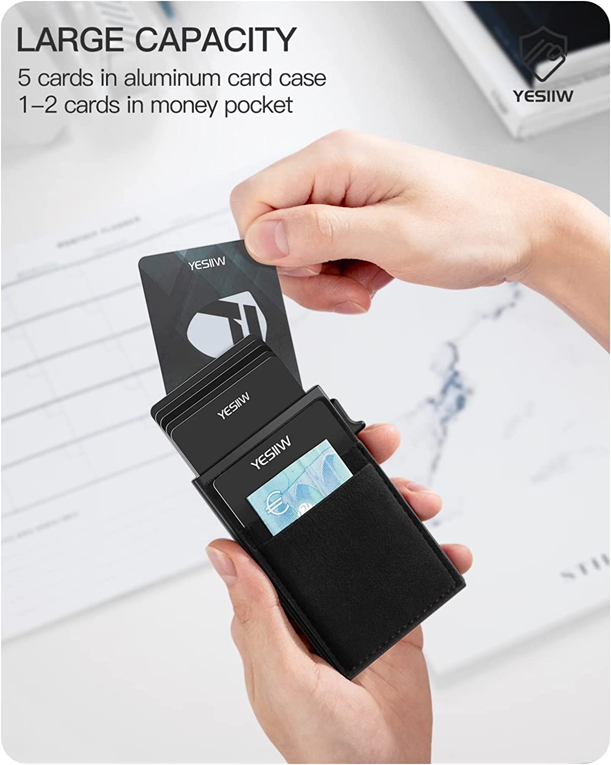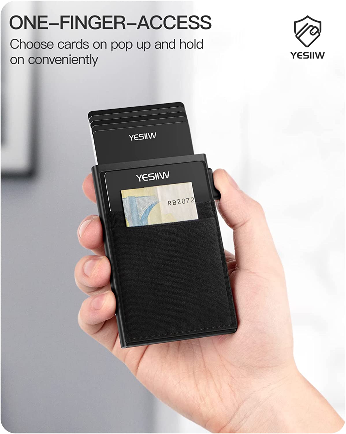 YESIIW Minimalist Pop up Card Holder Wallet for Men RFID Blocking | Slim Business Credit Card Wallet with Money Pocket | Aluminum Metal Bank Card Case for Notes and Coins and Debit Cards | Black